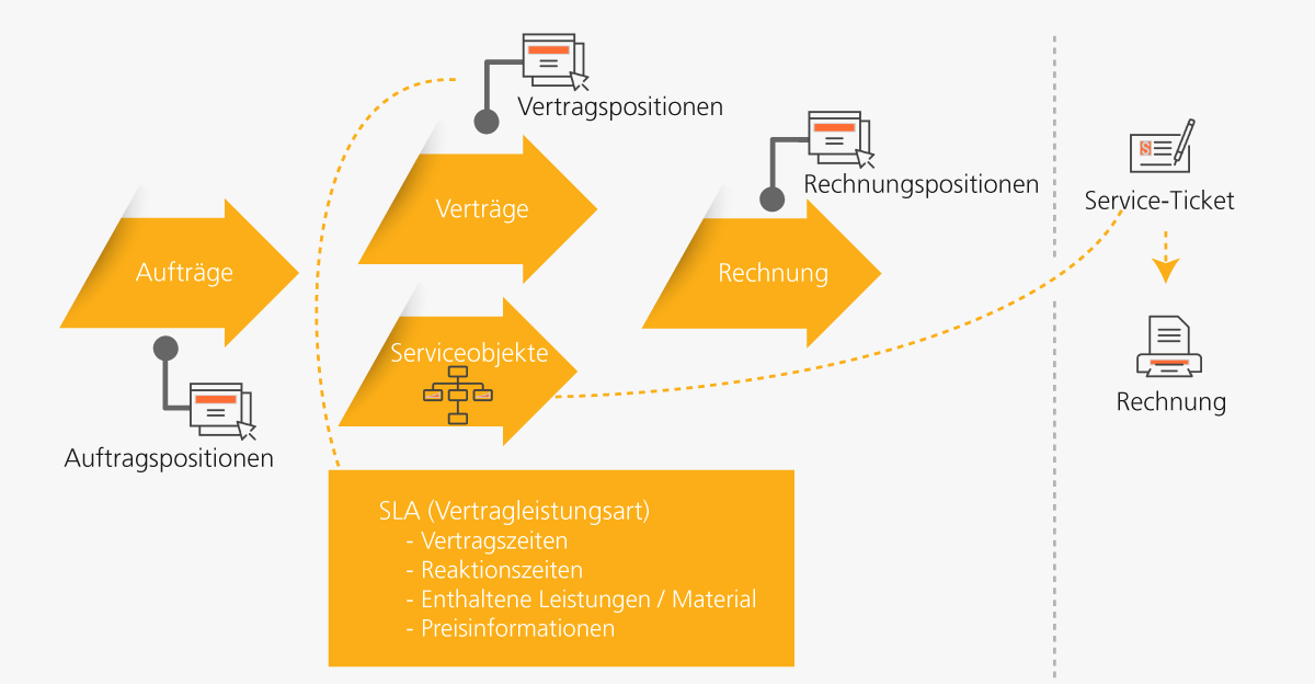 Vertragspositionen können direkt aus einem Auftrag oder einem Serviceobjekt automatisch generiert werden. Das Serviceobjekt erlaubt die Abbildung einer Anlage oder einer komplexen Installation in einer hierarchischen Struktur.