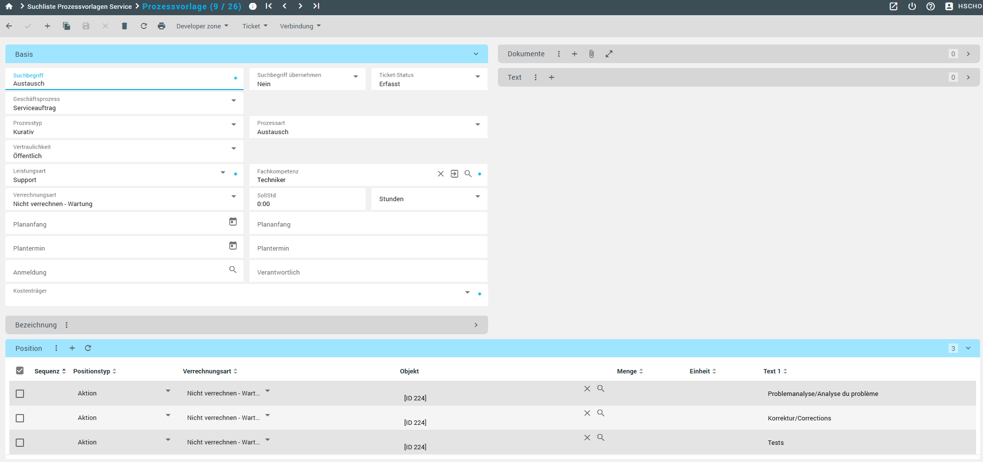 Auf jeder Position können n Prozessvorlagen hinterlegt und deren Auslösung mit diversen Parametern gesteuert werden. Aufgrund dieser Daten können automatisch Tickets / Aktionen ausgelöst werden (Präventivwartung). Die Prozessvorlagen mit Einsatzfrequenz „bei Bedarf“ werden in der Regel durch einen Anwender ausgelöst (siehe Ticket – Generieren).